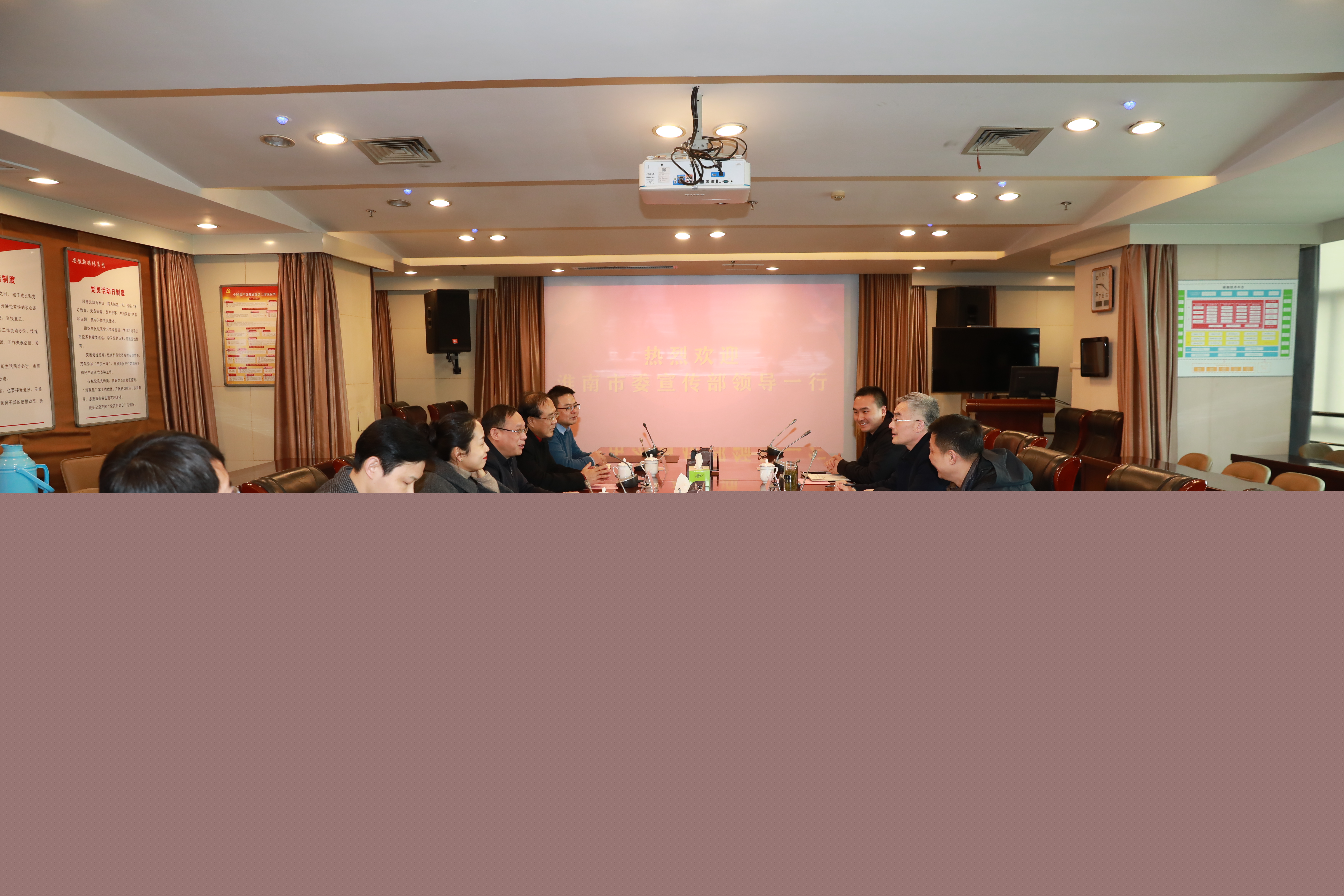 2月21日上午,淮南市委常委、宣傳部部長鄔平川,市委宣傳部副部長吳波,市委宣傳部辦公室主任馬浚一行赴安徽新媒體集團走訪調研。集團黨委書記、董事長、總經理章理中,集團黨委委員、副總經理陳鵬運等參加,雙方圍繞如何深入合作,做好新聞宣傳、活動策劃、新媒體產品制作等方面進行了認真交流。