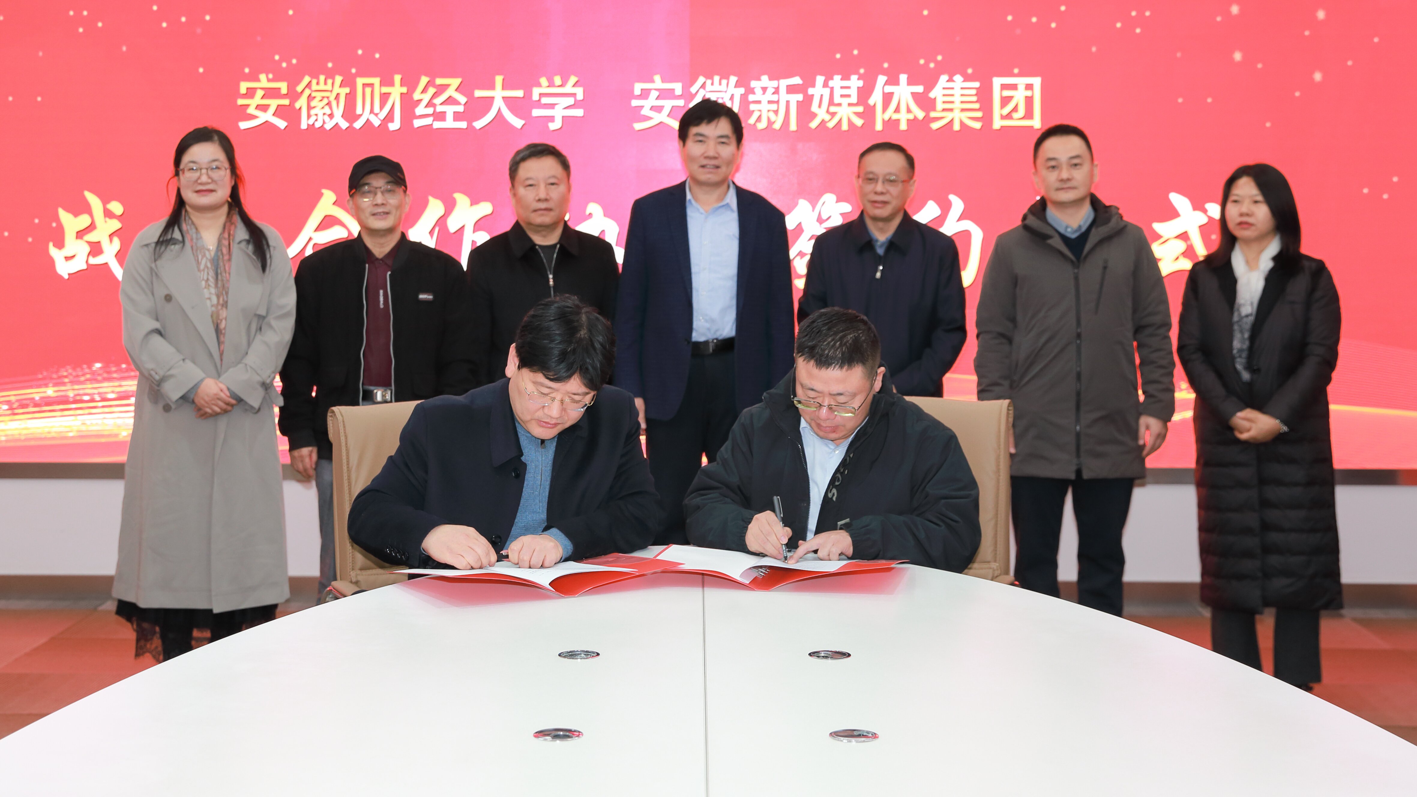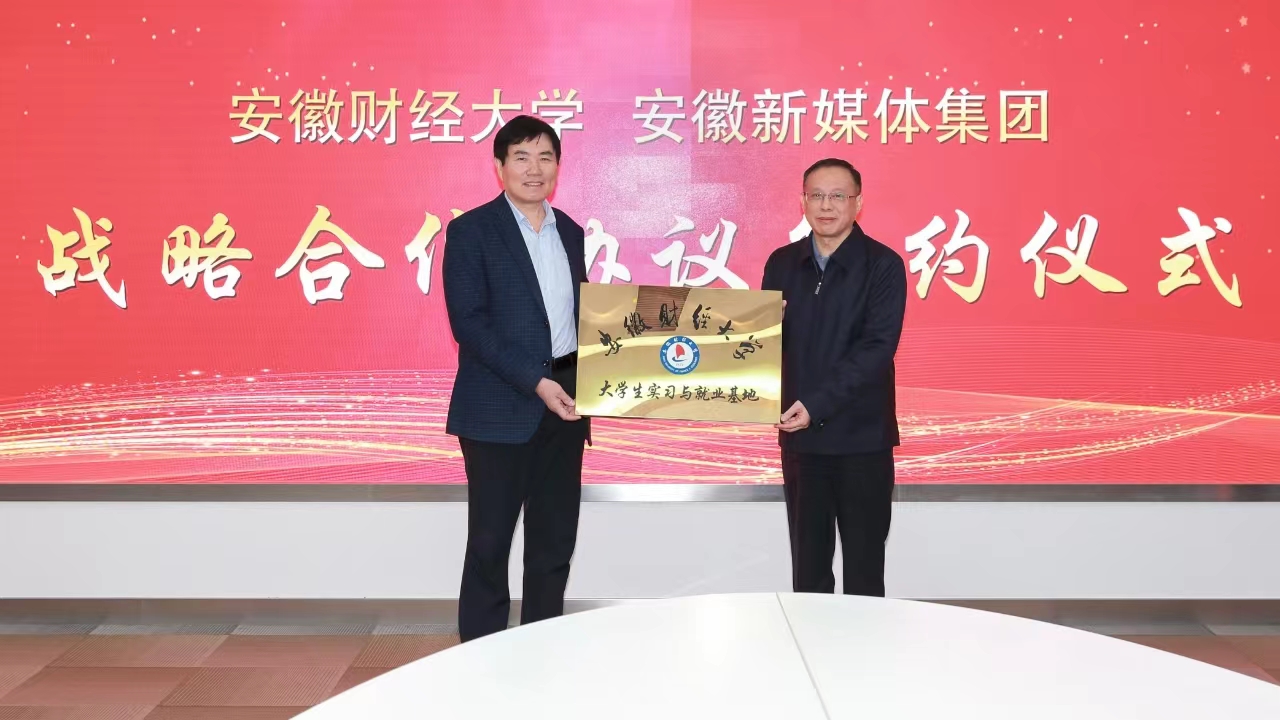 11月24日下午,安徽新媒體集團與安徽財經(jīng)大學簽訂戰(zhàn)略合作協(xié)議。安徽財經(jīng)大學黨委書記虞寶桃,安徽新媒體集團黨委書記、董事長、總經(jīng)理章理中共同為安徽新媒體集團“安徽財經(jīng)大學大學生實習與就業(yè)基地”揭牌,集團黨委委員、副總編輯陳偉出席簽約儀式。